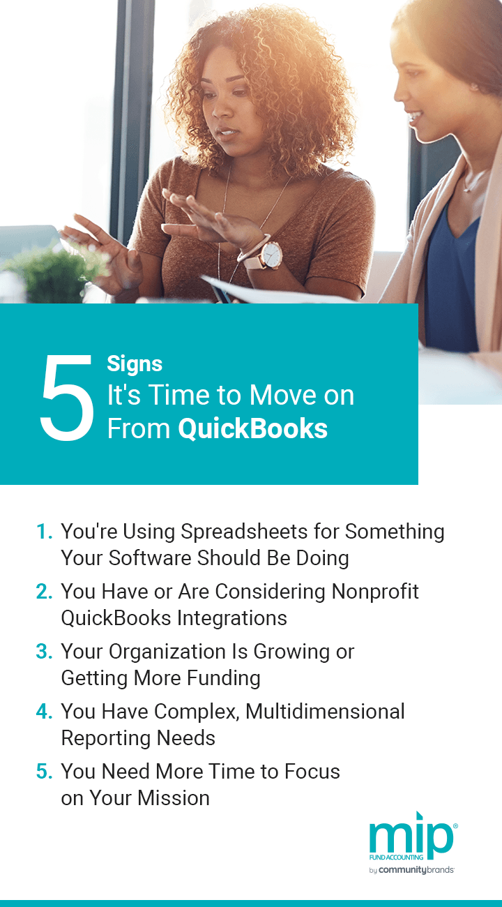 For most nonprofits, QuickBooks is fine as you’re starting out. Once you start growing, it becomes less and less useful. Your organization may have outgrown QuickBooks if: